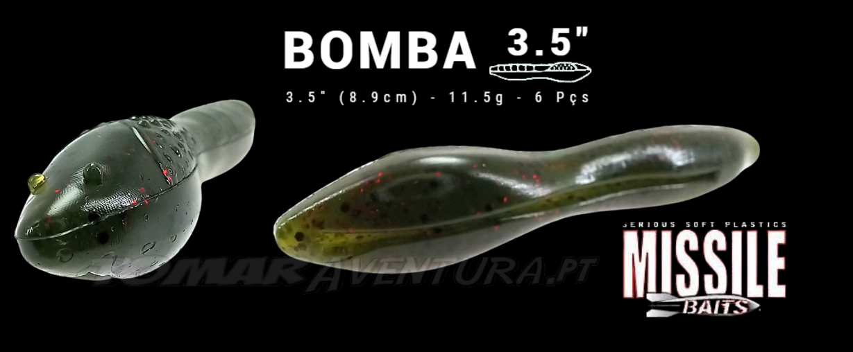 O Bomba 3.5 é um verme, grosso e rastejante que lança e salta como um foguete. Pense na combinação de Ned Rig e Senko. A isca se parece visualmente com um lagostim sem apêndices e tem uma ranhura para anzol na barriga para facilitar o lançamento do anzol. A Bomba 3.5 é principalmente montado a Texas, equipado sem peso para cair erraticamente no fundo enquanto desliza, balança e até mesmo se afasta. Muitas outras técnicas de captura de bass podem ser usadas com a Bomba, como Neko Rig, Ned Rig, Texas Rig e muito mais. A Bomba 3.5 virá tem 6 unidades por saco. utilize o Bomba 3.5 quando precisar de sutileza, mas ainda quiser um isco fácil de lançar.