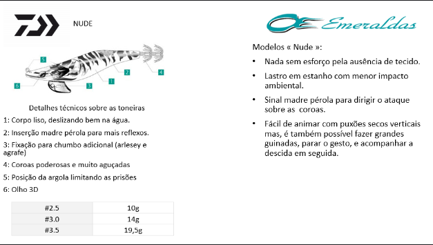 As toneiras Esmeraldas Nude são assim designadas porque não têm tecido a cobri-las, o seu corpo é liso, pelo que a amostra desliza melhor na água. Isso permitirá que nade muito facilmente com puxões secos na vertical ou fazendo-a balançar, interrompendo o gesto e acompanhando-o na descida. Graças a um revestimento nacarado em forma de losango que se encontra em cima da amostra, ela reflete ainda mais luz: os cefalópodes não resistirão a esse atrativo e ao realismo desta toneira, cujo olho é em 3D. Um orifício no lastro de estanho permitirá que adicione um chumbo com um agrafo. Outra característica prática: a sua argola está localizada na parte frontal da amostra, logo acima da cabeça, permitindo assim reduzir as prisões.