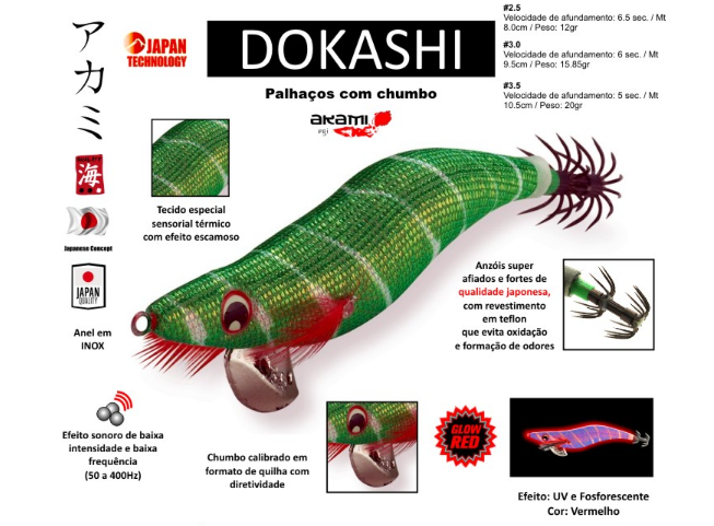 Provavelmente este palhaço vai ser o eleito na sua próxima pescaria: com o seu padrão de cor especial, o novo DOKASHI tem pintado no seu corpo colorido tiras de cor branca que dentro de água criam um efeito visual incrível, como se de uma presa real em fuga se tratasse, precipitando por impulso o predador no seu encalço! Como é habitual, na gama AKAMI, o DOKASHI tem um tecido de alta qualidade muito resistente, sensorial e térmico; a textura da sua cobertura têm um efeito escamoso e as suas cores com tratamentos UV tornam-se mais visíveis em águas mais escuras bem como o seu corpo, que é de uma alta fosforescência avermelhada! Este palhaço vem equipado com olhos 3D, anzóis de qualidade em aço de alta têmpera com elevado poder de penetração e grande nível de resistência revestidas a teflon. O seu formato apresenta-se mais fluído e realista e com um equilibro quase perfeito.