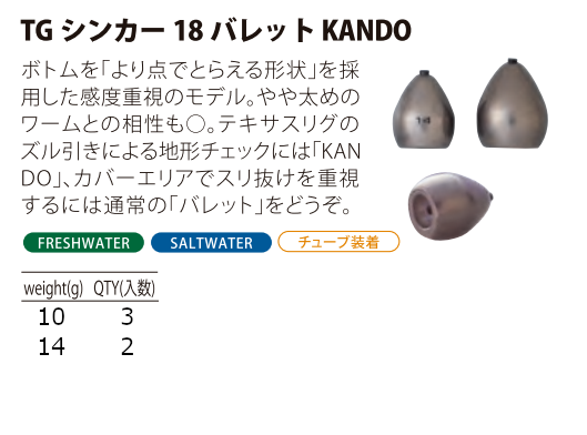 É um peso de tungstênio para montagens Texas. Embora os pesos normais tenham um formato esguio que enfatiza o deslizamento, este peso é projetado com ênfase na sensibilidade, adotando um "formato que captura o fundo ponto a ponto". Além disso, ao usar uma minhoca um pouco mais grossa, você pode criar uma sensação de unidade com o peso. Se quiser conhecer o terreno deslocando a montagem Texas, pode usar "Bullet KANDO".