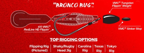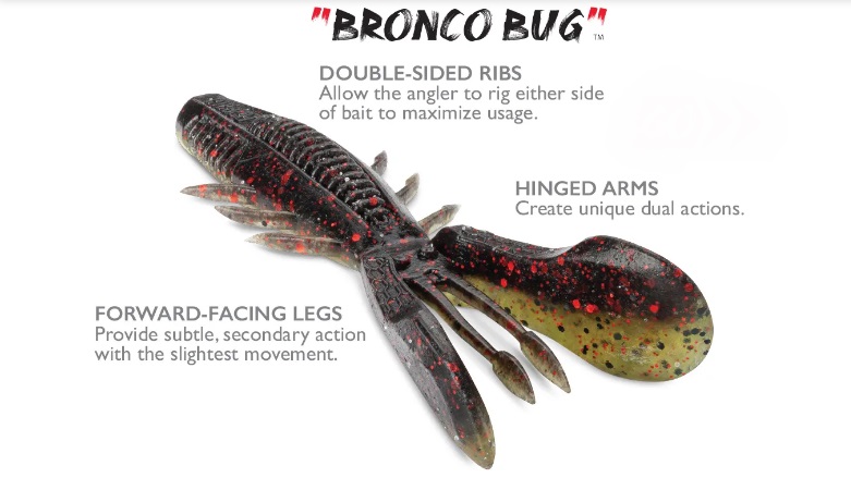 A oferta mais exclusiva da linha CrushCity™, o Bronco Bug™ oferece um corpo com ações que a maioria dos predadores nunca viu antes. Costelas de dupla face permitem ao pescador equipar ambos os lados do isco para maximizar o uso. Os braços articulados criam ações duplas exclusivas. As pernas voltadas para a frente proporcionam uma ação secundária sutil com o menor movimento.