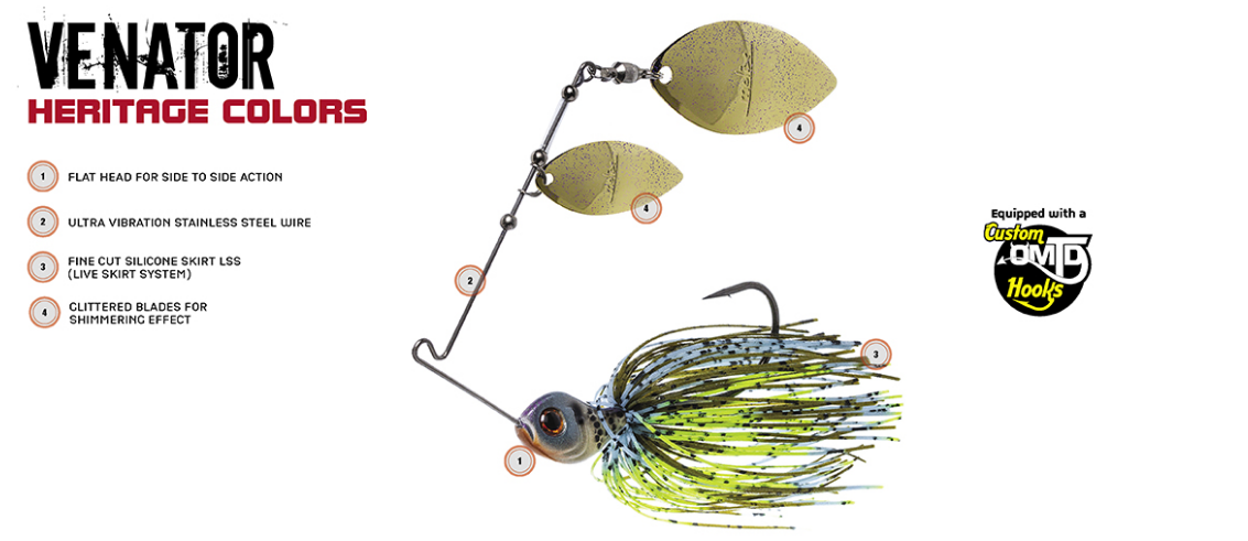 O Venator é construído com um fio de aço inoxidável “cónico”. É feito com um braço superior mais fino e flexível para desencadear mais vibrações diretamente nas lâminas e um braço inferior mais grosso para dar mais força quando precisa de balançar o peixe diretamente para dentro do barco. O anzol é feito com um arame grosso e a sua qualidade é muito elevada em comparação com outros spinnerbaits vendidos no mercado. Todas estas características fazem do novo Venator uma das amostras mais fortes e procuradas já construídas. Molix também prestou muita atenção ao formato da cabeça. Foi concebido com um formato especial de “cabeça plana” que proporciona o equilíbrio perfeito durante qualquer recuperação, bem como uma ação lateral super atraente. O olho 3D sobredimensionado atrai comprovadamente os peixes e confere um apelo natural a este isco. A saia é feita com silicone de “corte fino” e apresenta uma ação realista típica dos cardumes de peixes-isco. A lâmina de perfil largo utilizada no Venator ajuda a aumentar as vibrações mesmo durante recuperações a baixa velocidade e rolamento lento.