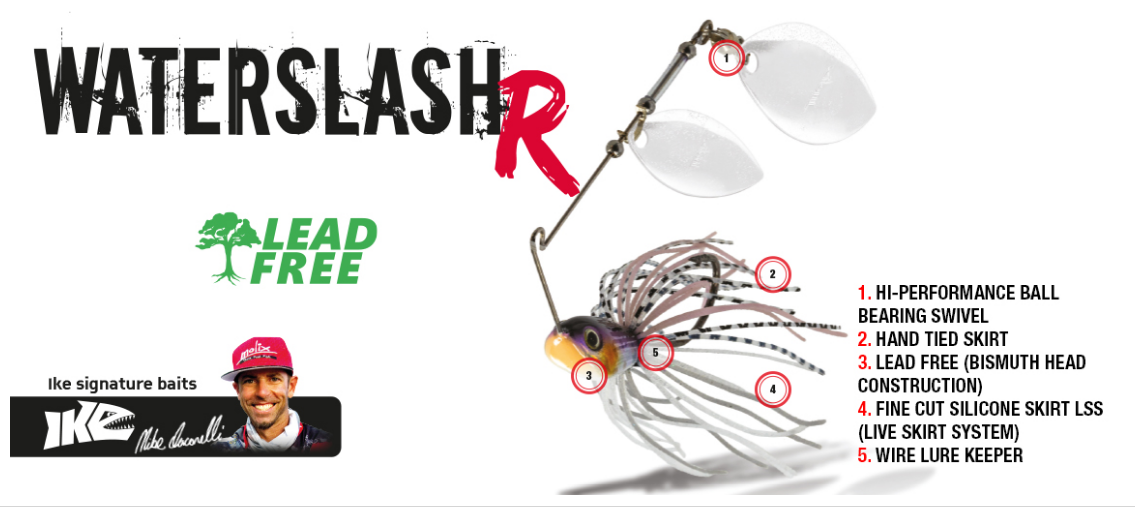 Um spinnerbait com um design compacto, extremamente adequado para a pesca em zonas com elevada pressão de pesca. O formato ligeiramente achatado da cabeça responde à necessidade de obter uma ação de "shimmy" perfeita a cada velocidade de recuperação, com uma posição de natação única. O peso das pás é calibrado para evitar a sobrecarga do spinnerbait e garantir que já está em ação assim que toca na água. A cabeça do WaterSlash R não contém chumbo, pois é feita de material de bismuto, que respeita o ambiente. O fio é construído com uma liga de aço cónico, com conicidade e diâmetro variáveis, que favorece a emissão de fortes vibrações. A elevada resistência do aço também o torna adequado para utilizações pesadas em áreas repletas de obstáculos. O olhal que liga o braço à pá principal é soldado e minimiza o risco de perda da pá. A saia de silicone de "corte fino" é atada à mão e acrescenta naturalidade ao nado da amostra. O anzol de alta qualidade possui um fixador de vermes no fio para segurar com segurança qualquer reboque macio.