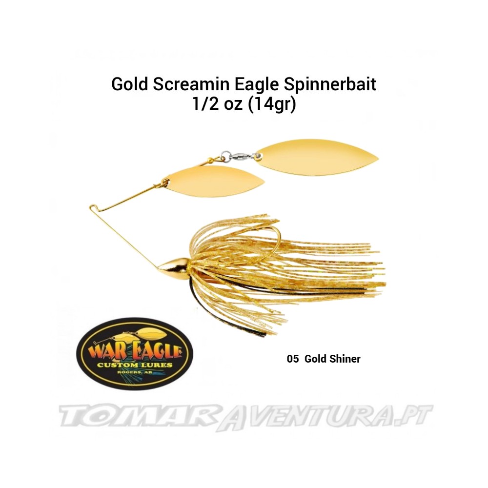 O Spinnerbait War Eagle Gold Screamin Eagle é do tamanho de um spinnerbait de 1/4 de polegada com o peso de um spinnerbait de 1/2 de oz, tornando-o ideal para cobrir água. Perfeito para aqueles momentos em que os graves procuram perseguir, o Screamin Eagle Spinnerbait segue a verdade, independentemente da rapidez com que você o recupera. Um gancho Mustad NeedlePoint premium ajuda a aumentar sua taxa de conexão, e as lâminas premium de salgueiro, os giros Sampo e o fio super inoxidável fornecem flash e vibração ideais. Também equipado com saias personalizadas amarradas à mão em uma variedade de cores, cada Spinnerbait War Eagle Gold Screamin Eagle é equilibrado com perfeição e pronto para ser executado imediatamente fora do pacote.
