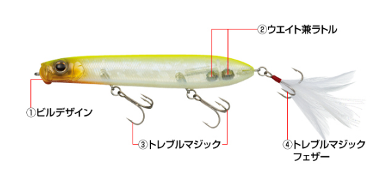 O anzol triplo com penas equipado na cauda apóia a sucção do anzol, trazendo a "ferrgem" , mesmo em condições onde é difícil, como um "brilho residual" entre a nitidez da ação "silenciosa" e "em movimento". .. Além disso, como o corpo reage ao Bing, a força da ação pode ser facilmente ajustada, mesmo com um pouco de trabalho com a cana. Quando você deseja atrair um peixe distante com uma ação violenta, ou quando deseja provocar um peixe nervoso com uma onda suave, você pode facilmente lidar com a diferença na preferência de ação do peixe dependendo das condições do dia.