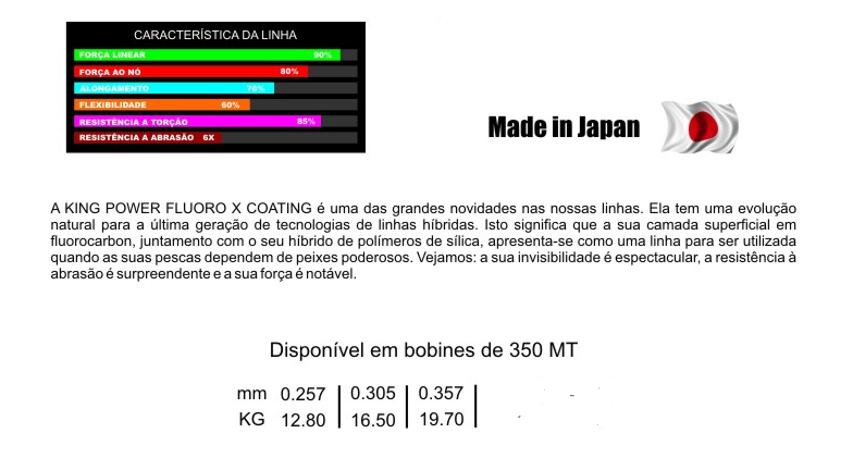 A KING POWER FLUORO X COATING é uma das grandes novidades nas nossas linhas. Ela tem uma evolução natural para a última geração de tecnologias de linhas híbridas. Isto significa que a sua camada superficial em fluorocarbon, juntamento com o seu híbrido de polímeros de sílica, apresenta-se como uma linha para ser utilizada quando as suas pescas dependem de peixes poderosos. Vejamos: a sua invisibilidade é espectacular, a resistência à abrasão é surpreendente e a sua força é notável.