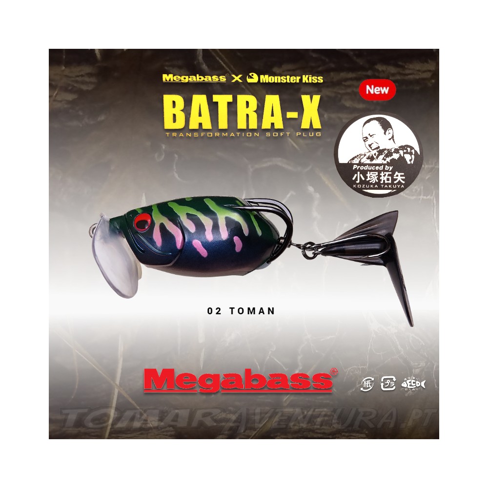 BATRA-X é o segundo trabalho conjunto de Monster Kiss e Megabass liderado pelo caçador de peixes monstro Takuya Kozuka. Cheio de mecanismos e funções inovadores que o diferenciam dos sapos ocos convencionais. O corpo em forma de bala, que é pequeno, mas tem um grande volume, proporciona uma ação de virada agradável e uma longa capacidade de lançamento. O copo macio original que pode ser fixado na parte frontal do corpo produz ação contínua e som ruidoso com recuperação livre, o que não era possível com sapos convencionais. Além disso, uma cauda estrondosa e um anzol duplo de cauda que atraem os peixes com som e vibração são presos à extremidade do destorcedor. O primeiro soft plug de transformação do mundo que permite prender / desprender cada parte de acordo com a situação e gosto.