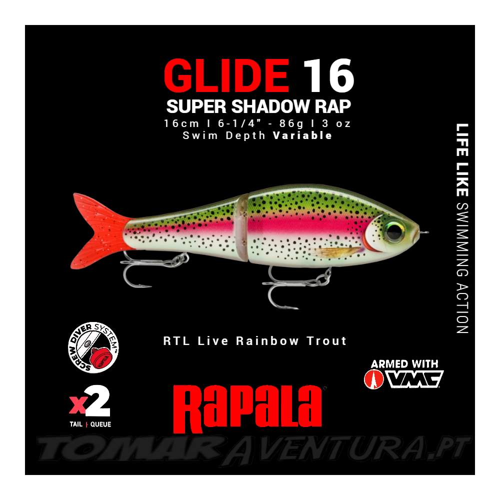 O Super Shadow Rap Glide nada num padrão S de captura de peixe, mas isto é apenas o início. Quando precisa de ajustar a profundidade da natação, o revolucionário Screw Diver System (SDS) permite modificar o peso do isco com pesos de tungsténio intercambiáveis. Basta aparafusar e desaparafusar! Mestre da adaptação, esta amostra articulada vem com uma cauda extra, permitindo-lhe escolher entre cores realistas e agressivas. Em recuperações constantes, o Super Shadow Rap Glide emite uma ação de natação lenta em padrão S – com contrações, a amostra nada com curvas curtas. E quando o peixe está fisgado, os anzóis rotativos aumentam as suas hipóteses de fisgar o peixe.