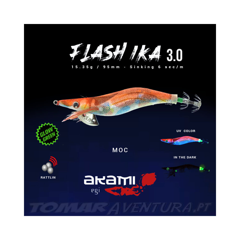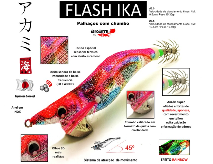 A AKAMI sempre se pautou pela primazia à sua qualidade, materiais nobres, performance e inovação. As novas toneiras da AKAMI FLASH IKA são fabricadas com tecnologia japonesa, desenvolvidas por engenheiros nipónicos. O seu novo pano agora é mais sensorial e térmico, tornando-se assim muito mais apetecível ao ataque dos chocos e lulas; outro detalhe notável foi o melhoramento dos seus anzóis , fabricados em aço inox de alta têmpera. A textura da sua cobertura têm um efeito escamoso e as suas novas cores com barrigas de cores rainbow e tratamentos UV tornam-se mais visíveis em águas escuras, bem como algums partes do seu corpo são de alta fosforescência ficando de um tom verde intenso e luminoso quando carregadas com uma lanterna UV. Quando animados, os FLASH IKA provocam vibrações sonoras às quais os cefalópodes são muito sensíveis pois também estão atentos a sons de baixa intensidade e baixa frequência (de 50 a 400 Hertz) . Os seus novos formatos apresentam-se mais fluídos e realistas, incluindo os seus olhos de efeito 3D!
