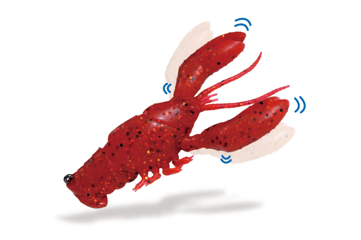 Devido ao material de alta flutuabilidade, as pinças flutuão ao atingir o fundo, imitando fielmente a aparência de um lagostim levantando as garras e ameaçando. Os braços projetados com uma base fina respondem rapidamente à ação da cana e ao fluxo de água e não se rasgam devido aos materiais altamente duráveis.
