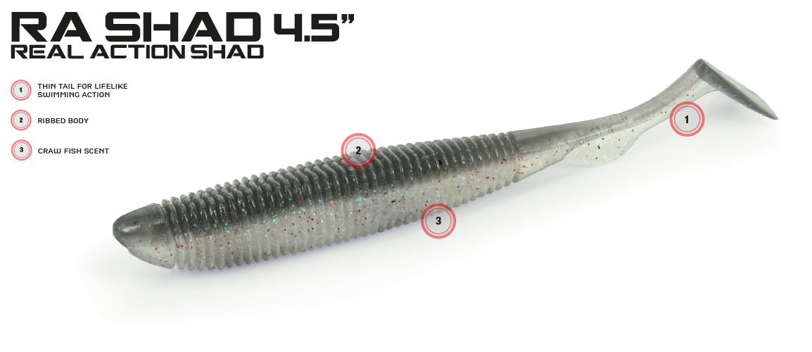 RA Shad “Real Action Shad” é um Soft Swimbait feito com uma mistura “mágica” de alta densidade, enriquecida com um novo aroma atraente à base de camarão e extrato de peixe. O seu formato e hidrodinâmica conferem-lhe estabilidade e uma ação de natação muito natural a qualquer velocidade de recuperação, com ou sem pesos adicionais. Grande versatilidade e eficácia tanto em água doce como salgada. A versão de 4,5” destina-se a predadores maiores, lúcios, robalos, peixe-gato e é também muito apreciada no mar para robalos, ulmeiros e dente-de-leão. RAShad4.5 RAShad 4.5 RAShad4.5 RAShad 4.5 Ação: Afundando Comprimento: 11,45 cm (4,5 pol.) Embalagem: 6 peças