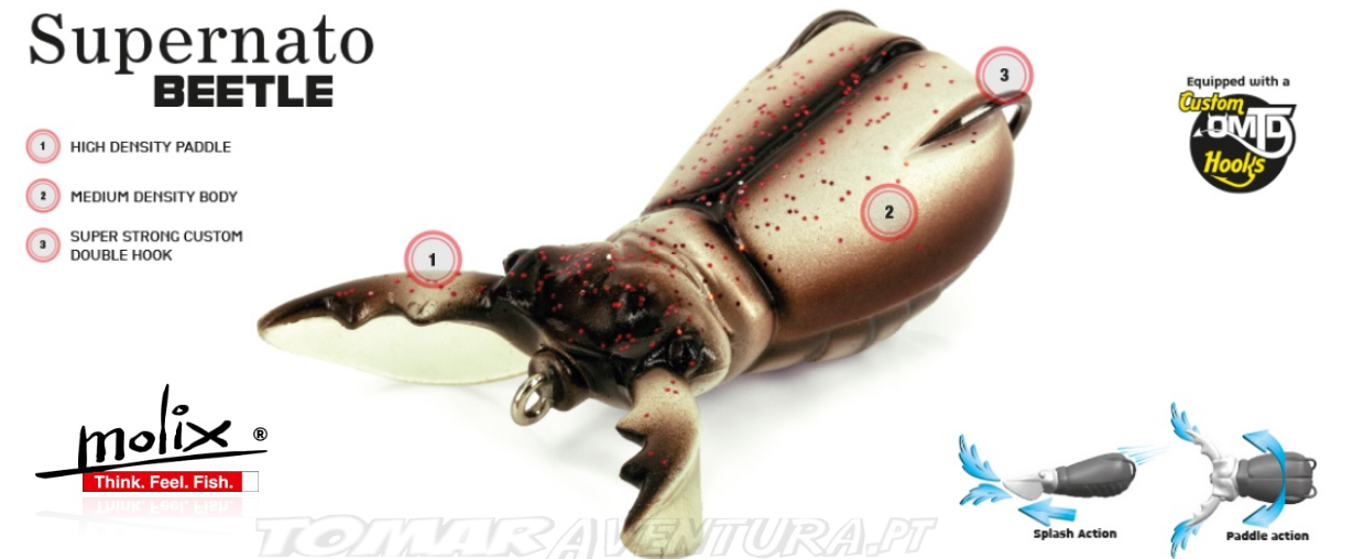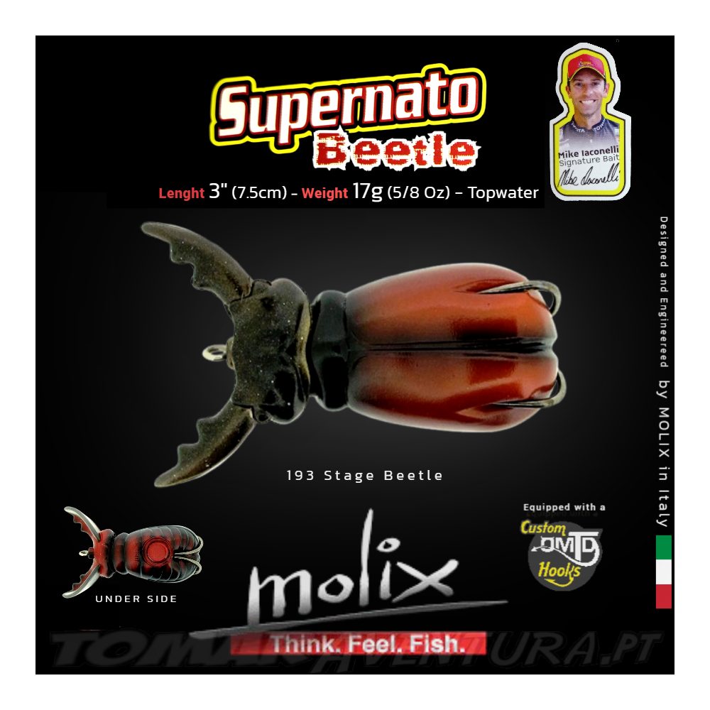 O Supernato Beetle vem de uma intuição de Mike "Ike" laconelli, Elite Pro Angler e Bassmas-ter Classic Champion, e foi projetado pela Molix em Itália. É único e extraordinariamente versátil. Fácil de pescar e bom para todas as águas abertas, bem como cobertura pesada ou vegetação intensa. É natural